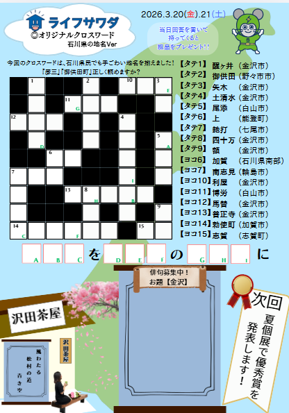 石川県の難読地名を揃えた、ちょっと手ごわい(!)クロスワードをご用意しました。正解者には粗品をプレゼントいたします!